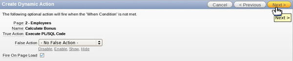 declare l_commission number; begin SELECT commission_pct INTO l_commission FROM employees WHERE employee_id = :P2_EMPLOYEE_ID; :P2_BONUS := :P2_SALES_AMOUNT*l_commission; end;Enter P2_EMPLOYEE_ID,P2_SALES_AMOUNT for Page Items to Submit and enter P2_BONUS for Page Items to Return and click Next.